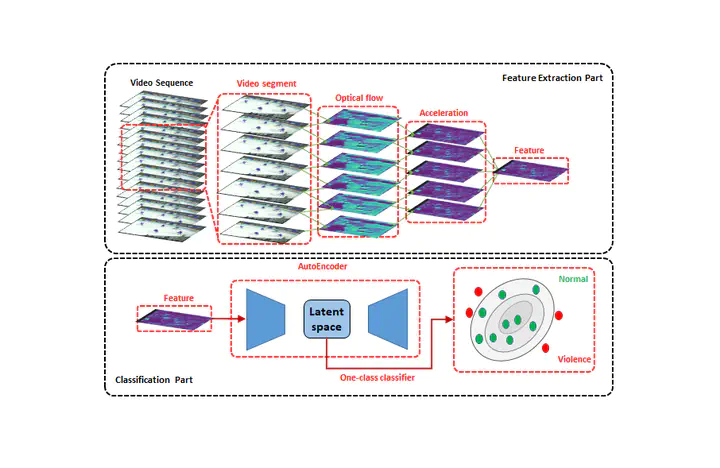 Violent crime is one of the main reasons for death and mental disorder among adults worldwide. It increases the emotional distress of families and communities, such as depression, anxiety, and post-traumatic stress disorder. Automatic violence detection in surveillance cameras is an important research area to prevent physical and mental harm. Previous human behavior classifiers are based on learning both normal and violent patterns to categorize new unknown samples. There are few large datasets with various violent actions, so they could not provide sufficient generality in unseen situations. This paper introduces a novel unsupervised network based on motion acceleration patterns to derive and abstract discriminative features from input samples. This network is constructed from an AutoEncoder architecture, and it is required only to use normal samples in the training phase. The classification has been performed using a one-class classifier to specify violent and normal actions. Obtained results on Hockey and Movie datasets showed that the proposed network achieved outstanding accuracy and generality compared to the state-of-the-art violence detection methods.
